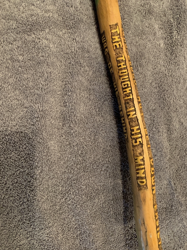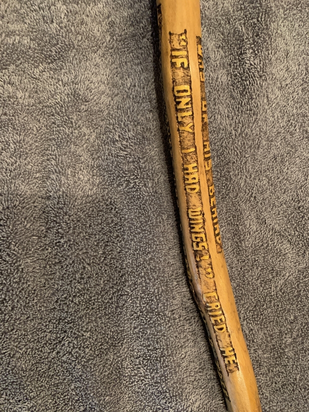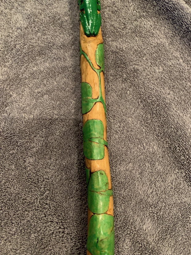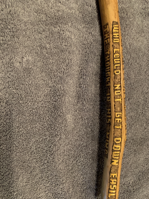 Carved Text: There once was a frog in a tree Who could not get down easily The thought in his mind Was of his behind "If only I had wings", cried He! (by Mike Johnson)