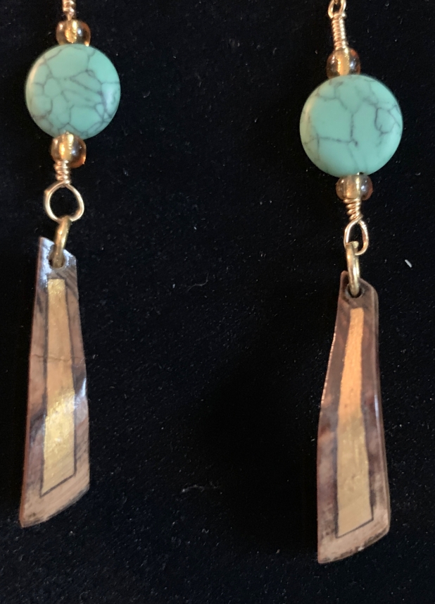 Dark brown discs with illusion inlay bar; turquoise bead
