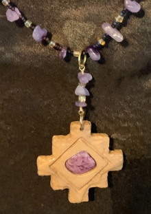 Hand Carved Cross with inset Purple Stone on 20" Beaded Chain